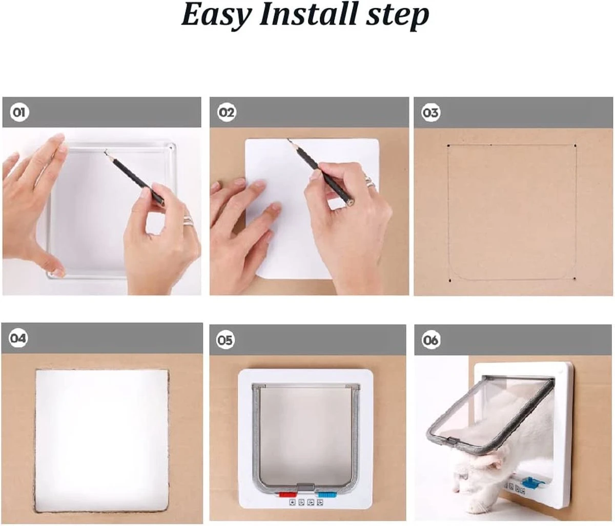 8 schroeven en bijbehorende doppen in de set maken een eenvoudige installatie mogelijk in ramen, deuren, kasten, panelen en muren, enz. Schroef de 8 schroeven voor 4 gaten aan beide zijden in, als het kattenluik te dik is voor de deur waarop u wilt worden bevestigd, kunt u de tunneldiepte inkorten met een schaar, zaag of snijmachine.