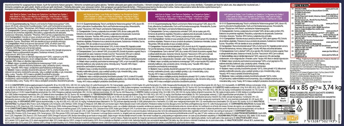 FELIX Elke Dag Feest is een assortiment onweerstaanbare maaltijden die er zó lekker uitzien, zó lekker ruiken en zó lekker smaken alsof je het zelf hebt klaargemaakt! Speciaal bereid met zachte stukjes in een overheerlijke gelei. Jouw deugniet zal elke keer weer genieten van een onweerstaanbare maaltijd. Deze heerlijke maaltijden vormen ook een bron van essentiële omega 6-vetzuren met de juiste combinatie van uitgebalanceerde vitaminen die jouw kat energie zullen geven en klaar zullen maken om nog meer kattenkwaad uit te halen. Ze zitten vol gezonde ingrediënten om 100% te voldoen aan de behoeften van jouw kat indien gevoed volgens de voedingsrichtlijnen op de verpakking.