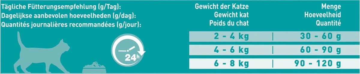 | Voedingsadvies | Voedingsadvies per 24 uur Gewicht kat: 2 – 4 kg; Hoeveelheid: 30 – 65 g Gewicht kat: 4 – 6 kg; Hoeveelheid: 65 – 95 g Gewicht kat: 6 – 8 kg; Hoeveelheid: 95 – 125 g De dagelijkse aanbevolen hoeveelheden dienen te worden aangepast aan de weersomstandigheden, het activiteitenpatroon en de fysieke conditie van de kat. Zorg ervoor dat er altijd schoon en vers drinkwater klaarstaat. |