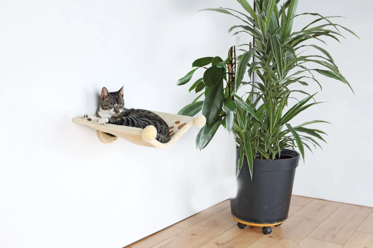 De Trixie Hangmat Voor Aan De Muur Beige van 42 x 41 cm is een hangende kattenmand uit een metalen frame met zachte polyester bekleding. Of jij nu wilt dat jouw kat dicht bij jou in de buurt kan liggen of hij veel overzicht over de ruimte heeft: deze hangmat kun je overal ophangen waar je wilt! Deze comfortabele ligplek voor de kat is eenvoudig aan de muur te bevestigen. De mat heeft een stevig metalen frame en is bekleed met zacht pluche (polyester). Voorzien van een ingenaaid pootadrukje en geschikt om te gebruiken voor klimlandschappen.