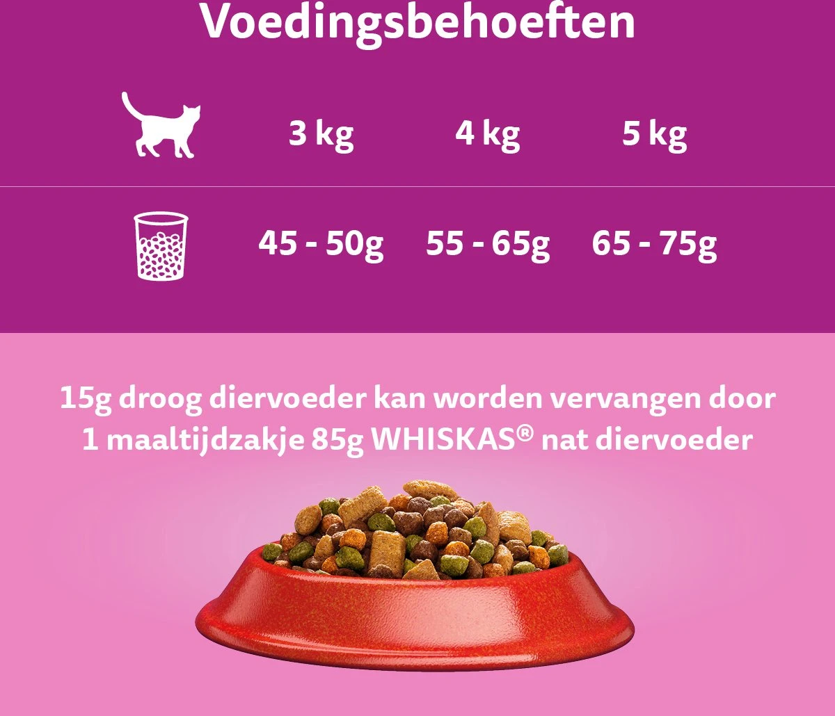 Je volwassen kat houdt van het goede leven. Soms zelfs nét een beetje te veel… Daarom geeft WHISKAS® 1+ Droogvoer haar precies de juiste hoeveelheid energie die ze nodig heeft om een gezond gewicht te behouden.
